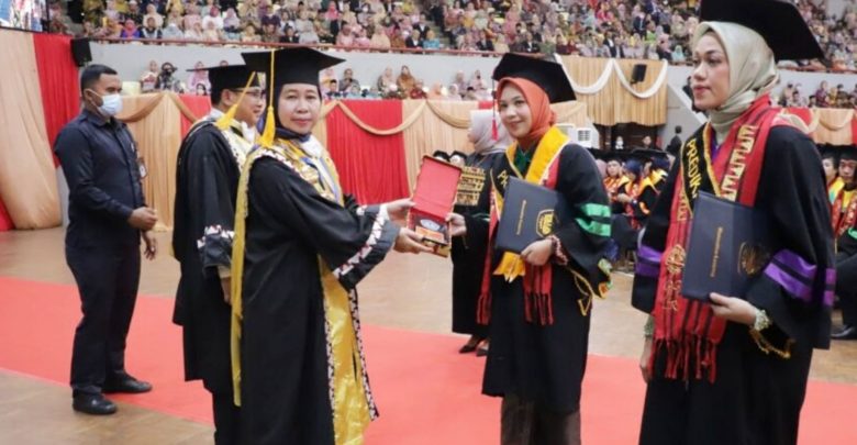 Rektor Unila Prof. Dr. Ir. Lusmeilia Afriani, D.E.A., I.P.M, memberikan plakat kepada salah satu wisudawan terbaik pada Wisuda Periode IV Tahun Akademik 2022/2023 di GSG Unila, Sabtu 18 Maret 2023. ISTIMEWA
