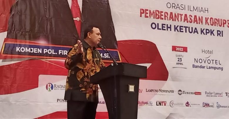 Ketua KPK Firli Bahuri, saat orasi ilmiah tentang pemberantasan korupsi pada pengukuhan pengurus JMSI Lampung, di Hotel Novotel Lampung, Bandar Lampung, Sabtu (23/4/2022). ISTIMEWA