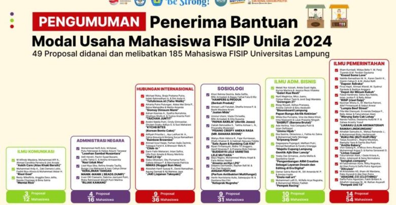 SMARTNEWS.ID – Fakultas Ilmu Sosial dan Ilmu Politik (FISIP) Universitas Lampung (Unila) mengumumkan penerima bantuan modal usaha mahasiswa tahun 2024. Sebanyak 49 proposal terpilih mendapatkan pendanaan, melibatkan 185 mahasiswa dari enam jurusan di FISIP.