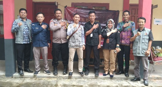 Ketua PPK Kecamatan Way Sulan Nurdin Saputra beserta Panwalu Kecamatan Way Sulan Masdar Helmi, Komisioner KPU Lampung Selatan Irsan Didi, Staf KPU Lampung Selatan Irwan dan Bhabinkamtibmas Bripka Supriadi berfhoto bersama usai melihat proses tes wawancara penerimaan anggota PPS di Kecamatan Way Sulan, Lampung Selatan. Rabu (18/01/2023). FHOTO : SMARTNEWS.ID/ACENG
