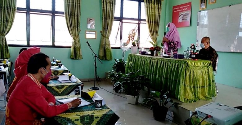 Sekretaris Disdikbud Bandar Lampung, Hj. Eka Afriana (kanan), saat memimpin rapat persiapan vaksinasi pelajar SMP, bersama sejumlah kepala SMP negeri dan swasta di Bandar Lampung. ISTIMEWA
