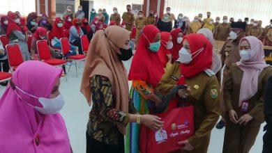 Sekretaris Disdikbud Bandar Lampung, Eka Afriana, S.Pd., M.Si (hijab kuning), menerima cendera mata dari Komisi I DPRD Tanah Datar, Sumatera Barat. SMARTNEWS.ID