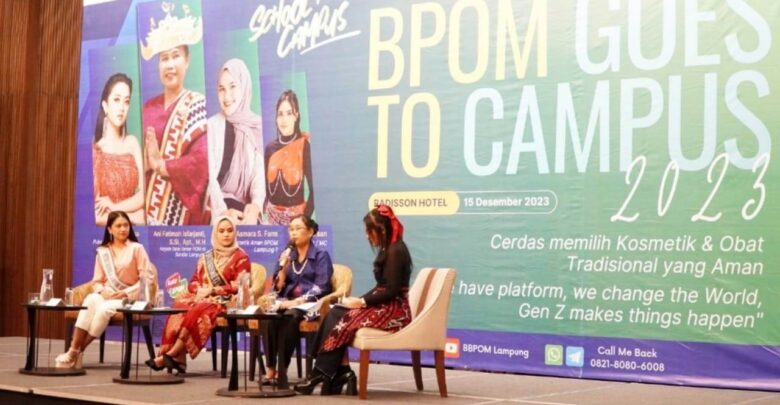 Hadir sebagai narasumber, Kepala BBPOM di Bandarlampung, Ani Fatimah Isfarjanti, Putri Indonesia Lampung Busana Daerah 2023, Ade Annisa, dan Duta Kosmetik Aman BPOM Lampung 1, Winda Asmara.