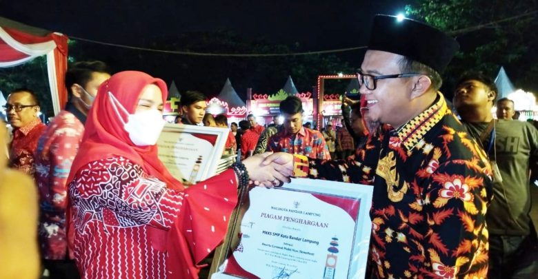 Wali Kota Bandar Lampung Eva Dwiana, memberikan penghargaan kepada salah satu peserta Begawi dan Bandar Lampung Expo, di Lapangan Saburai Kecamatan Enggal, Minggu malam, 18 Juni 2023. ISTIMEWA