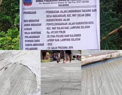 SMARTNEWS.ID – Proyek pembangunan peningkatan jalan lingkungan di Dusun Tanjung Sari, Desa Banjar Sari, Kecamatan Way Sulan Kabupaten Lampung Selatan, diduga kurang berkualitas dan kurangnya pengawasan oleh pihak terkait, sehingga menjadi pertanyaan oleh masyarakat sekitar. Pasalnya, jalan yang belum selesai dibangun itu, kini kondisinya sudah mengalami retak.