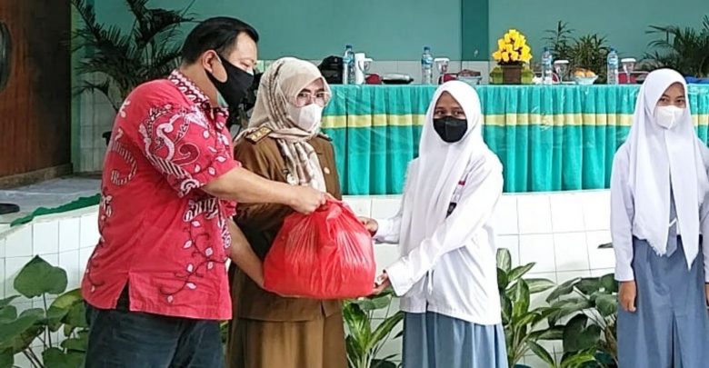 Kabid PSMA Disdikbud Lampung Diona Katharina, S.Sos., M.Pd (dua kiri), didampingi Sekretaris PSMTI Lampung Steven Cheng, menyerahkan bantuan secara simbolis, pada kegiatan berbagi kasih untuk 100 siswa SMA berprestasi dan berbakti, di SMAN 9 Bandar Lampung, Senin (25/10/2021). ISTIMEWA