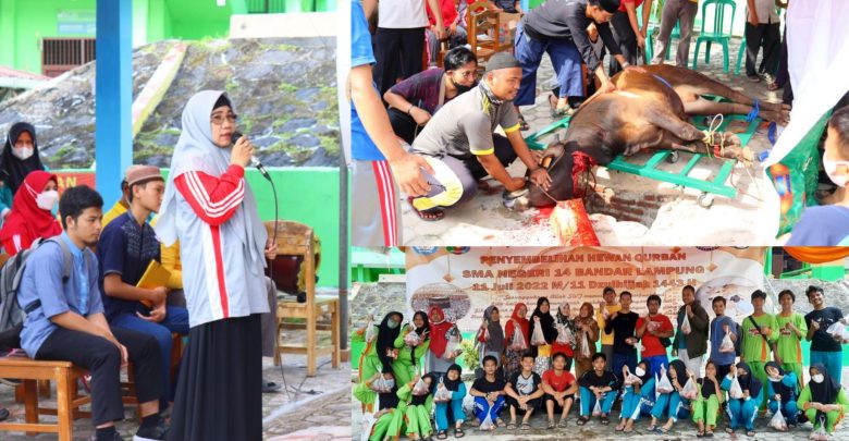 SMARTNEWS.ID – SMAN 14 Bandar Lampung, menyembelih 5 ekor sapi sebagai kurban pada perayaan Idul Adha 1443 Hijriah, di sekolah setempat, Senin (11/7/2022).