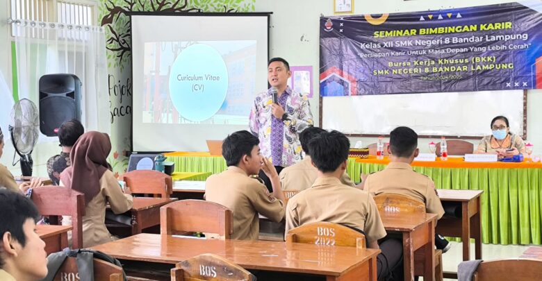 Salah satu nara sumber kegiatan bimbingan karir saat memberikan materi di hadapan siswa SMKN 8 Bandar Lampung, Jumat, 20 September 2024. DOK SEKOLAH