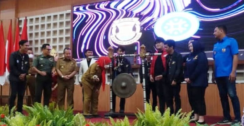 Wali Kota Bandar Lampung Eva Dwiana memukul gong, sebagai tanda dibukanya Millenial Fest 2023, di Gedung Semergou, Pemerintah Kota Bandar Lampung, Senin, 12 Juni 2023. ISTIMEWA