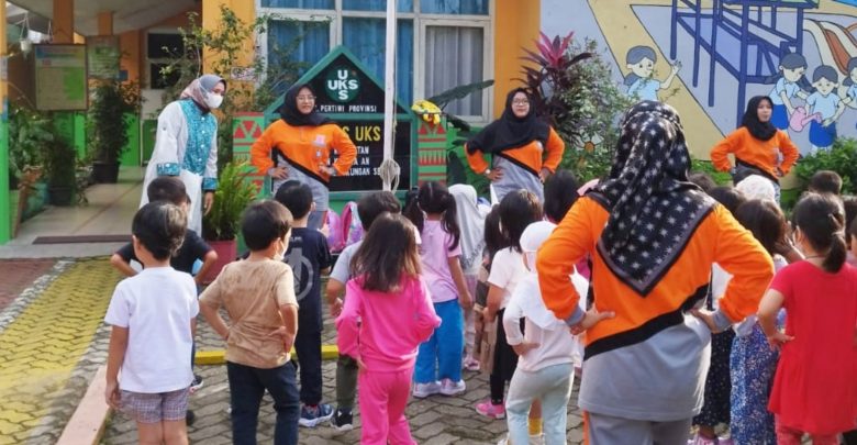 Di tengah berolahraga, dengan lembut seraya tersenyum Bunda PAUD menyapa para siswa. Sapaannya pun dibalas dengan keceriaan oleh siswa yang notabene masih anak-anak itu.