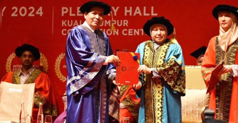 Penyematan gelar profesor tersebut dilakukan langsung oleh Yang Amat Berbahagia Toh Puan Datuk Wira (Dr) Hajah Asmah Binti Haji Abdul Rahman DCSM BKT PBB, Chancellor of UGM, didampingi oleh Prof Datuk SR Dr. Mohaizi Bin Mohamad PGDK ASDK FRISM MAALS, Chairman Board Of Governors UGM.