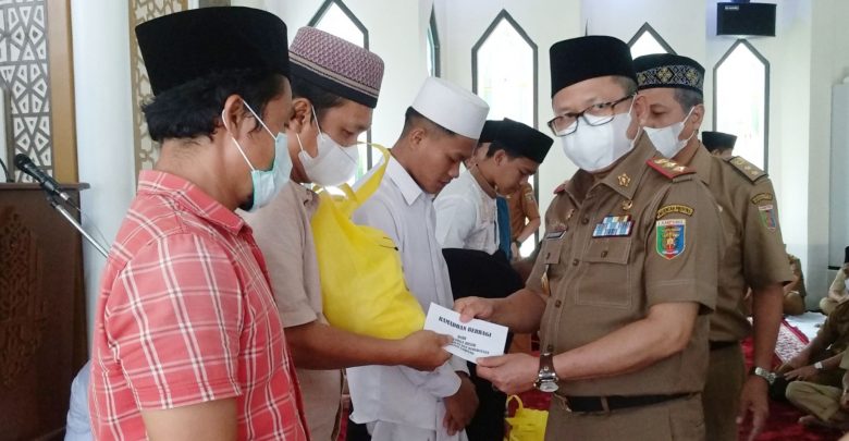Kepala Disdikbud Lampung Drs. Sulpakar, M.M, simbolis menyalurkan bantuan sembako dan uang tunai kepada masyarakat yang membutuhkan, pada peringatan Nuzulul Quran 1443 H, di Masjid Iqra kompleks dinas setempat, Senin (18/4/2022). ISTIMEWA