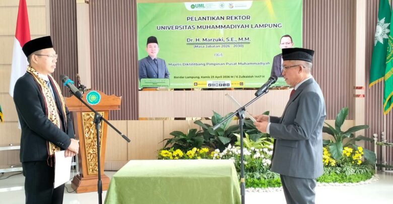 SMARTNEWS.ID – Dr. Marzuki, SE., M.M. dilantik menjadi Rektor Universitas Muhammadiyah Lampung (UM Lampung) periode 2026-2030 menggantikan Dr. Mardiana, M.Pd.I. Pelantikan berlangsung di Gedung Hj.Siti Walidah kampus 2 UM Lampung di Sukarame Kamis, 23 April 2026.