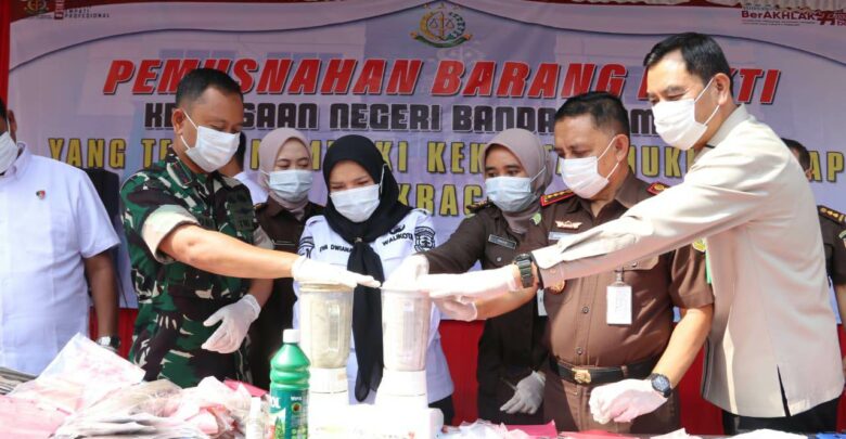 Secara seremonial Wali Kota Eva Dwiana bersama Kejari Bandar Lampung dan Forkopimda Bandar Lampung melakukan pemusnahan barang bukti dengan cara memblender dan membakar barang bukti hasil kejahatan tersebut.