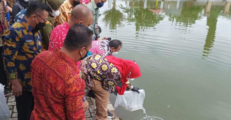 SMARTNEWS.ID – Walikota Bandar Lampung Eva Dwiana menebar 10.000 bibit Ikan Nila dan ikan mas di Embung Sukarame, Kamis (10/22022).
