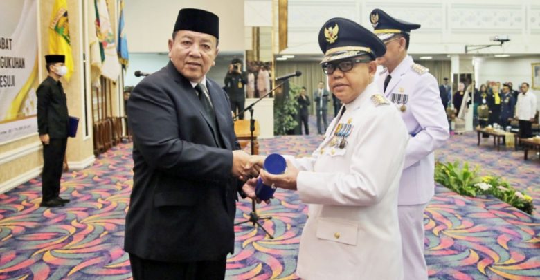 Gubernur Lampung Arinal Djunaidi, mengukuhkan Kepala Disdikbud Lampung Drs. Sulpakar, M.M, kembali sebagai Pj Bupati Mesuji, di Balai Keratun, Kantor Pemerintah Provinsi Lampung, Senin, 22 Mei 2023. ISTIMEWA