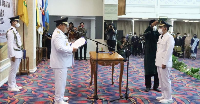 Gubernur Lampung Arinal Djunaidi melantik dan mengukuhkan Wakil Bupati Lampung Utara, Ardian Saputra, di Balai Keratun, Pemerintah Provinsi Lampung, Jumat (10/6/2022). ISTIMEWA