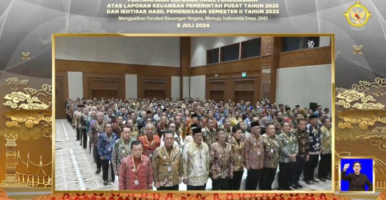 SMARTNEWS.ID – Penjabat (Pj) Gubernur Lampung Samsudin, menghadiri acara Penyampaian Laporan Hasil Pemeriksaan (LHP) atas Laporan Keuangan Pemerintah Pusat (LKPP) Tahun 2023 dan Ikhtiar Hasil Pemeriksaan Semester (IHPS) II Tahun 2023 di Jakarta Convention Center, Senin, 8 Juli 2024.
