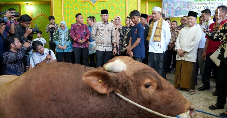 SMARTNEWS.ID – Gubernur Lampung, Rahmat Mirzani Djausal, menyerahkan secara simbolis seekor sapi kurban bantuan kemasyarakatan dari Presiden Republik Indonesia kepada pengurus Masjid Jami Nurussa’adah, Kelurahan Panjang Utara, Kota Bandar Lampung, Kamis, 5 Juni 2025.