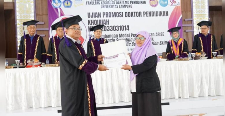 SMARTNEWS.ID – Guru SMP Negeri 32 Bandar Lampung Khoiriah, M.Pd, berhasil mempertahankan hasil penelitian disertasinya untuk memperoleh gelar Doktor, pada ujian terbuka Promosi Doktor Pendidikan di Gedung Aula K FKIP Universitas Lampung (Unila), Kamis, 29 Februari 2024.