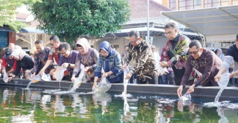 Rektor Prof. Lusmeilia, bersama jajaran, secara simbolis melepas ikan di kolam ikan FISIP, Jumat pagi, 28 Juli 2023. ISTIMEWA