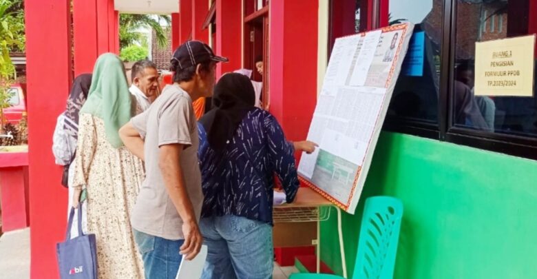 Wali murid calon peserta didik, saat melihat hasil PPDB di SMPN 18 Bandar Lampung, Rabu, 5 Juli 2023. ISTIMEWA