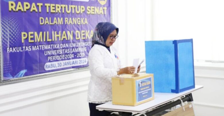 Proses pemilihan dekan untuk periode 2024—2028 berlangsung di Ruang Sidang Dekanat lantai dua FMIPA, dipimpin Ketua Senat Dr. Junaidi, S.Si., M.Sc., dan juga dihadiri Rektor Unila Prof. Dr. Ir. Lusmeilia Afriani, D.E.A., IPM., ASEAN Eng., bersama seluruh anggota senat FMIPA Unila.