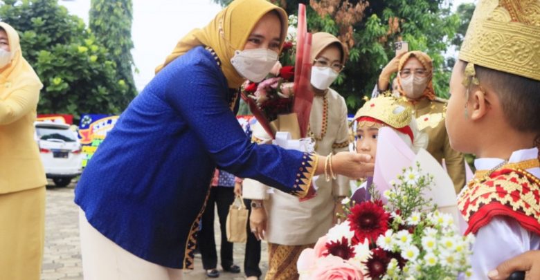 Bunda PAUD Lampung, Riana Sari Arinal, menyapa siswa PAUD pada peringatan HUT ke-72 IGTK PGRI, di Gedung LPMP Kota Bandar Lampung, Senin (30/5/2022). ISTIMEWA
