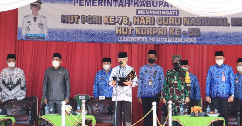Hal itu dikatakan Bupati Pringsewu Sujadi Saddat saat upacara HUT ke-76 PGRI, Hari Guru Nasional (HGN) 2021, serta HUT ke-50 Korpri, di lapangan Pemkab setempat, Kamis (25/11/2021).