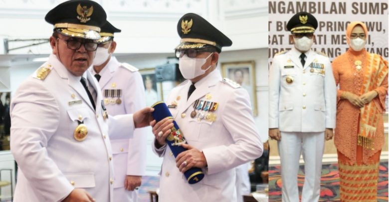 Gubernur Lampung Arinal Djunaidi (kiri), menyerahkan SK pengangkatan Pj Bupati Mesuji kepada Sulpakar, di Balai Keratun Kompleks Kantor Gubernur Lampung, Minggu (22/5/2022). Foto kanan, Pj Bupati Mesuji mengabadikan momen bersama istri tercinta Pori Karlia, saat pelantikan. SMARTNEWS.ID
