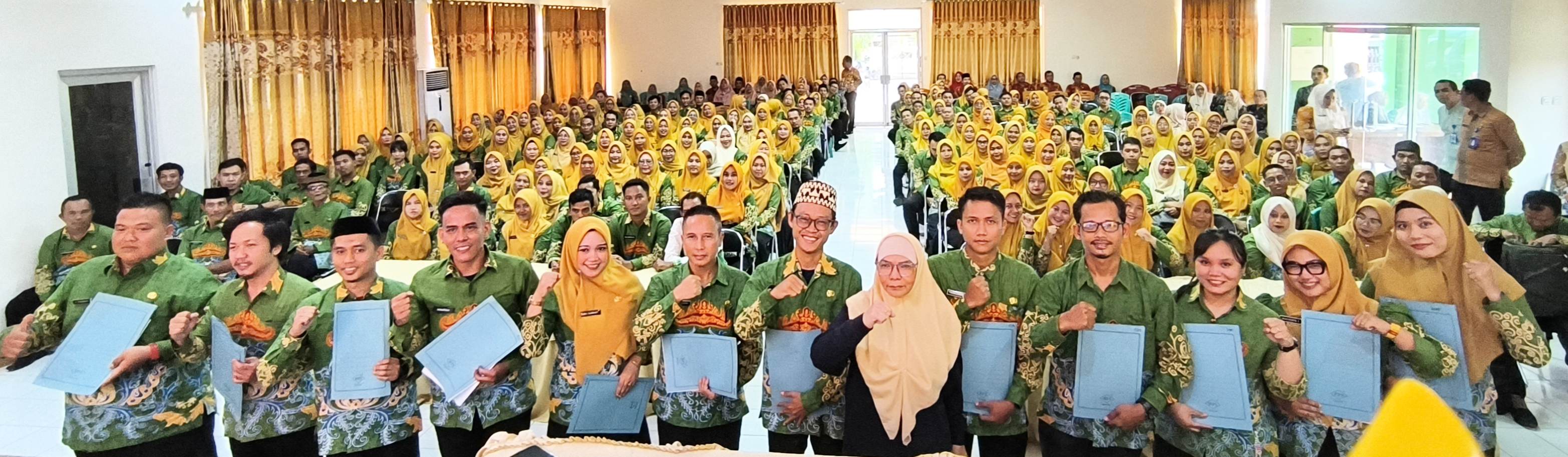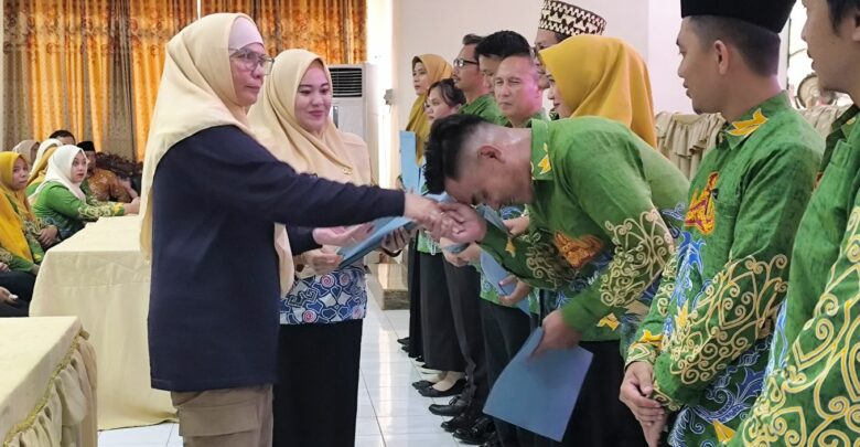 Plt Kepala Disdikbud Hj. Eka Afriana, S.Pd, menyerahkan SK secara simbolis kepada perwakilan guru, di aula dinas setempat, Jumat, 27 Februari 2026. DOK DISDIKBUD