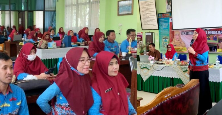 Kepala Disdikbud Bandar Lampung, Hj. Eka Afriana, S.Pd, saat memotivasi para guru pada kegiatan IHT Pemanfaatan Platform Merdeka Belajar, di SMPN 7 Bandar Lampung, Kamis, 6 Juli 2023. DOK SEKOLAH
