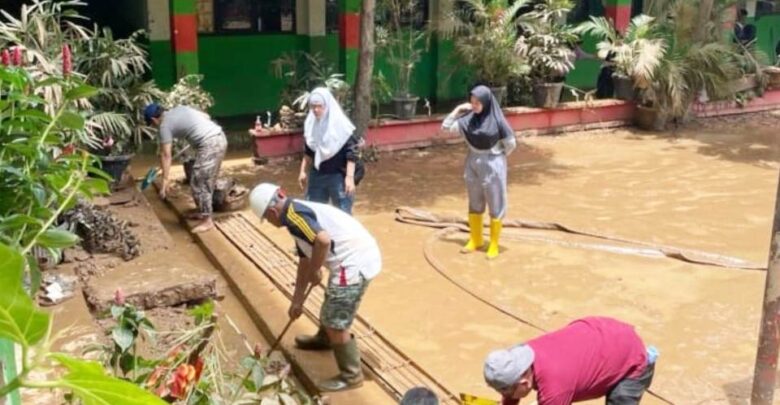 Meski banjir telah surut pada malamnya, namun material sampah dan lumpur masih menggenangi area sekolah. Warga sekolah berjibaku membersihkan material tersebut.