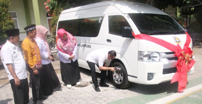 Kepala Disdikbud Lampung, Drs. Sulpakar, M.M, memecahkan kendi di roda mobil sebagai tanda bahwa mobil pemberian dari komite kepada SMAN 5 Bandar Lampung, sudah resmi digunakan, Kamis, 14 September 2023. DOK SEKOLAH