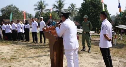 Kepala Pekon Talang Sepuh, Purwanto, saat menjadi inspektur upacara peringatan HUT ke-78 RI, di hlalaman kantor pekon setempat.