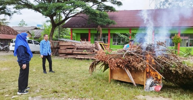 Meski pagi itu cuaca mendung disertai hujan gerimis, namun keinginan Kepala Disdikbud mempercantik sekolah, tak bisa dihentikan. Bahkan, ia rela mengangkut kotoran sampah dan menumpuknya menjadi satu untuk di bakar.