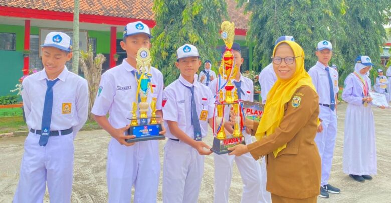 Kepala SMPN 13 Bandar Lampung, Amaroh, S.Pd., M.M, memberikan piala kepada salah satu siswa berpretasi, di lapangan sekolah setempat, Senin, 31 Juli 2023. DOK SEKOLAH