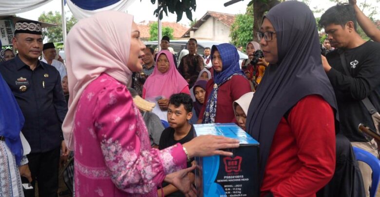 SMARTNEWS.ID – Ketua Tim Penggerak PKK Provinsi Lampung, Purnama Wulan Sari Mirza, menyerahkan bantuan paket sembako, Usaha Ekonomi Produktif (UEP), dan alat bantu Disabilitas, di Desa Margorejo, Metro Selatan, Kota Metro, Kamis, 13 Maret 2025.