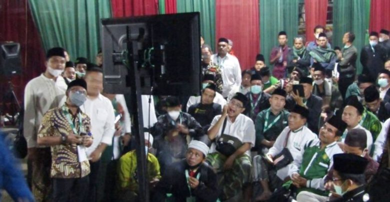 Peserta Muktamar Ke-34 NU menyaksikan penghitungan perolehan suara dari luar GSG Universitas Lampung, Jumat (24/12/2021) pagi. Foto: JOS