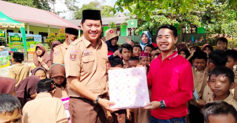 Kepala SDN 2 Batu Putuk Bandar Lampung, Heri Risdiyanto, S.Pd, saat memberikan kenang-kenangan kepada perwakilan komunitas sosial Kampung Dongeng Lampung, Sabtu (3/9/2022). DOK SEKOLAH