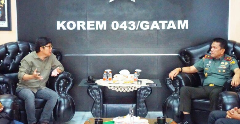 Danrem 043/Gatam, Brigjen TNI Rikas Hidayatullah, S.E., M.M (kanan), saat berdialog dengan Ketua Taring Lampung Yusmart DS, saat menerima pengurus Taring di Makorem setempat, Rabu, 12 Februari 2025. ISTIMEWA