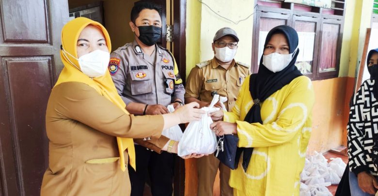 Kepala SMPN 43 Bandar Lampung, Rohaida, S.Pd (kiri), menyerahkan daging kurban kepada masyarakat sekitar sekolah yang membutuhkan, Selasa (12/7/2022). DOK SEKOLAH