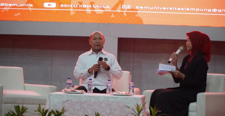 Selain itu, turut hadir sebagai narasumber Tin Latifah, S.P., M.Si., Staf Ahli Menteri Pertanian, serta Dr. Budiyono, akademisi Unila. Acara ini dihadiri oleh Wakil Rektor Universitas Lampung Prof. Sunyono, para Wakil Dekan III di lingkungan Unila, serta diikuti oleh pengurus BEM tingkat universitas dan fakultas serta mahasiswa.