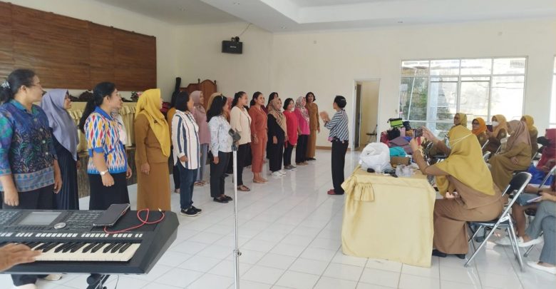 Kepala Disdikbud Bandar Lampung, Hj. Eka Afriana, saat menyaksikan penampilan paduan suara Mars PAK, yang akan mengisi kegiatan Hakoridia, di aula Disdikbud, Senin (5/12/2022). ISTIMEWA