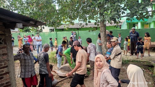 Panitia penyembelihan hewan kurban Masjid Ainul Yaqin Patoman, Kecamatan Pagelaran, Kabupaten Pringsewu nampak sedang sibuk membagikan daging hewan kurban kepada masyarakat sekitar. Kamis (29/06/2023). FHOTO : SMARTNEWS.ID/Aris