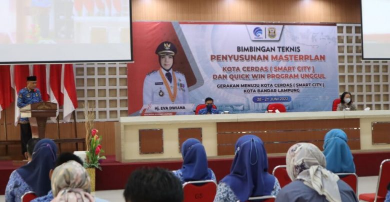 SMARTNEWS.ID – Asisten III, Bidang Administrasi Umum Setda Kota Bandar Lampung, Yan Wardi mewakili Wali Kota Bandar Lampung membuka resmi Bimbingan Teknis Penyusunan Masterplan Kota Cerdas (Smart City) dan Quick win program Unggulan Bandar Lampung Tahun 2022 yang di hadiri oleh 70 peserta yang terdiri dari kasubbag penyusun program ,mitra pemkot bertempat di Aula Semergo, Senin (20/06/2022).