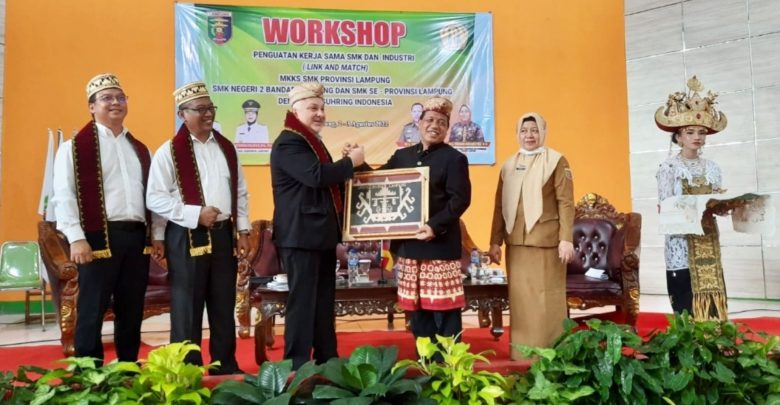 Ketua MKKS SMK Lampung, Drs. Moh Edy Harjito, menyerahkan cendera mata kepada Managing Director PT Guhring Indonesia pada kegiatan workshop Penguatan Kerja Sama SMK dan Industri, di SMKN 2 Bandar Lampung, Selasa (2/8/2022). DOK SMKN 2