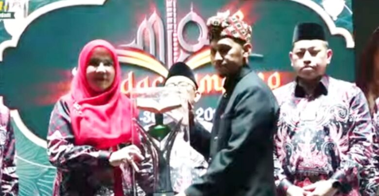 Wali Kota Bandar Lampung Eva Dwiana, menyerahkan piala bergilir kepada tuan rumah MTQ Kecamatan Kedaton, pada pembukaan MTQ ke-53 Tingkat Kota Bandar Lampung, di Stadion Mini Way Dadi Sukarame, Senin malam, 27 Mei 2024. ISTIMEWA