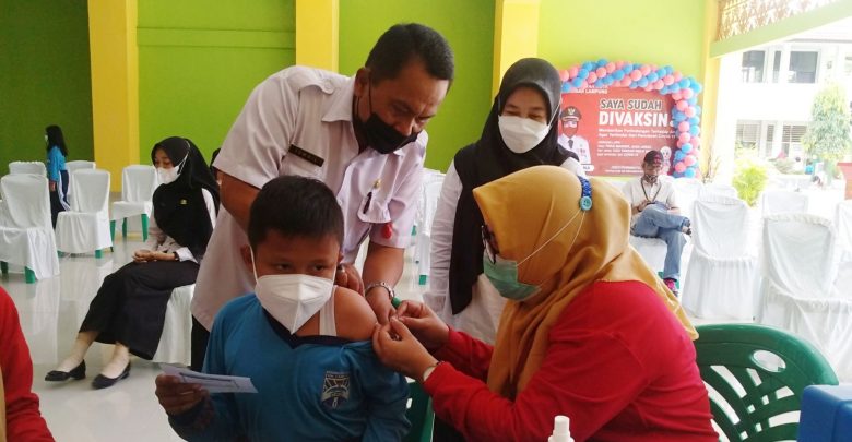 Salah satu siswa saat menjalani vaksinasi Covid-19, di SDN 2 Rawalaut Kota Bandar Lampung, beberapa waktu lalu. DOK