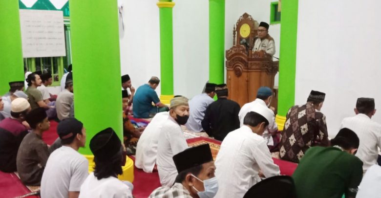 Korwil IV Disdikbud, Ismail (di mimbar), membacakan sambutan Wali Kota Bandar Lampung Eva Dwiana, pada safari Ramadan di masjid Nurhasanah, Keluruhan Campang Raya, Kecamatan Sukabumi, Selasa (5/4/2022) malam. DOK